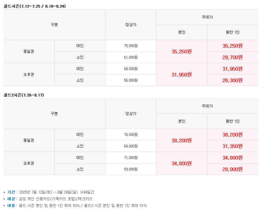 성수기인 골드2시즌에 해당하는 가격(삼성카드 우대가 기준, 본인·동반 1인 동일 적용)은 다음과 같습니다: