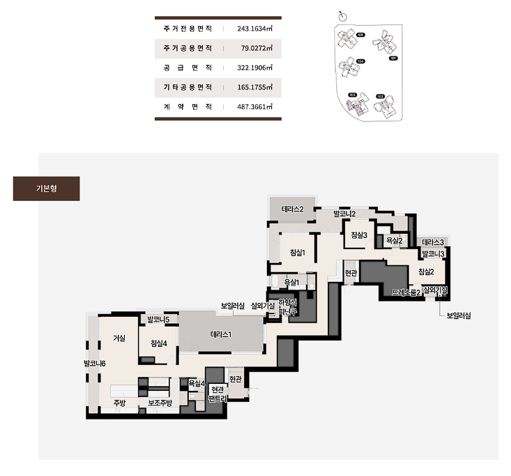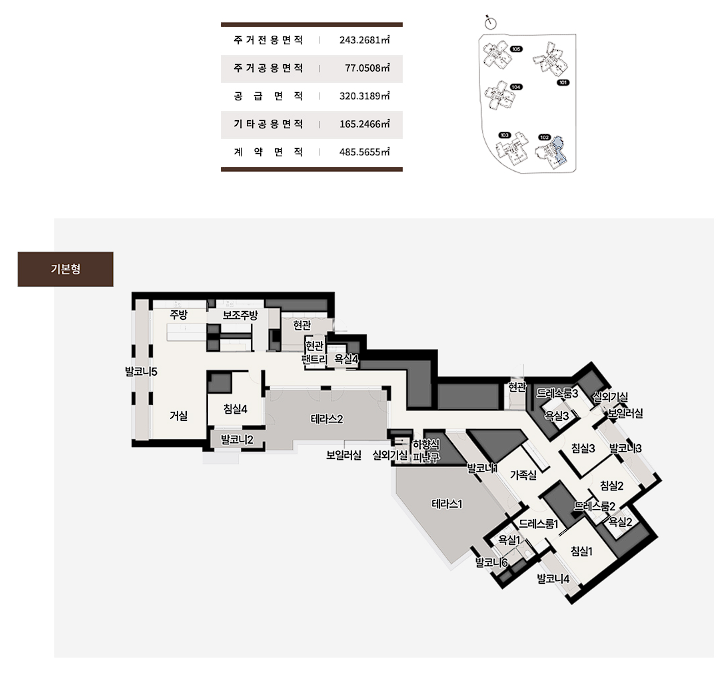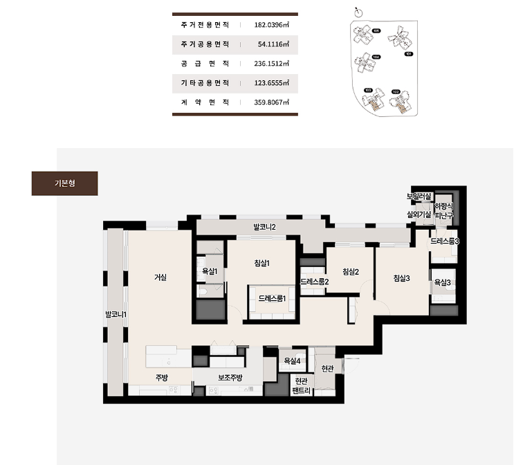 - 전용 테라스, 대형 드레스룸, 개인용 엘리베이터 포함 세대도 있음