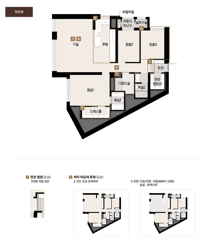 - 안방 욕실에 욕조 포함, 드레스룸 넓게 구성