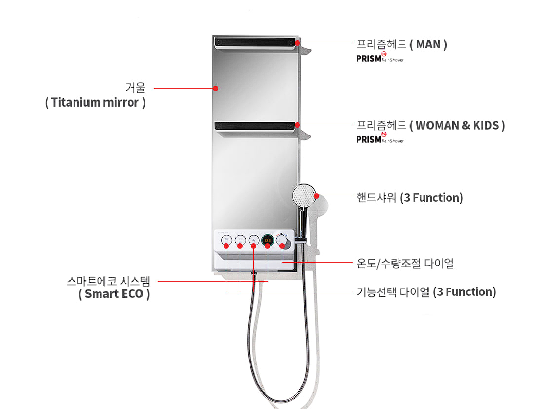 가로 분사 레인샤워(프리즘 헤드) ↔ 스틱 핸드샤워 ↔ 멀티 샤워, 버튼 하나로 즉시 전환 가능한 스마트 샤워기 설계가 특징입니다.