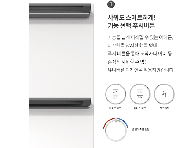 상단 헤드는 키 큰 성인용, 하단 헤드는 아이나 키 작은 사용자용으로 높이가 나뉘어 있어, 남녀노소 누구나 몸 구석구석 깨끗이 헹구기 좋습니다.사용해보면 물이 몸에 닿는 느낌이 좋다고 하네요 - 3WAY 버튼식 모드 전환