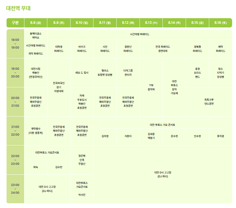 좋아하는 가수 무대와 보고 싶은 퍼레이드를 미리 체크해, 여름밤 대전의 열기를 온몸으로 느껴보세요!