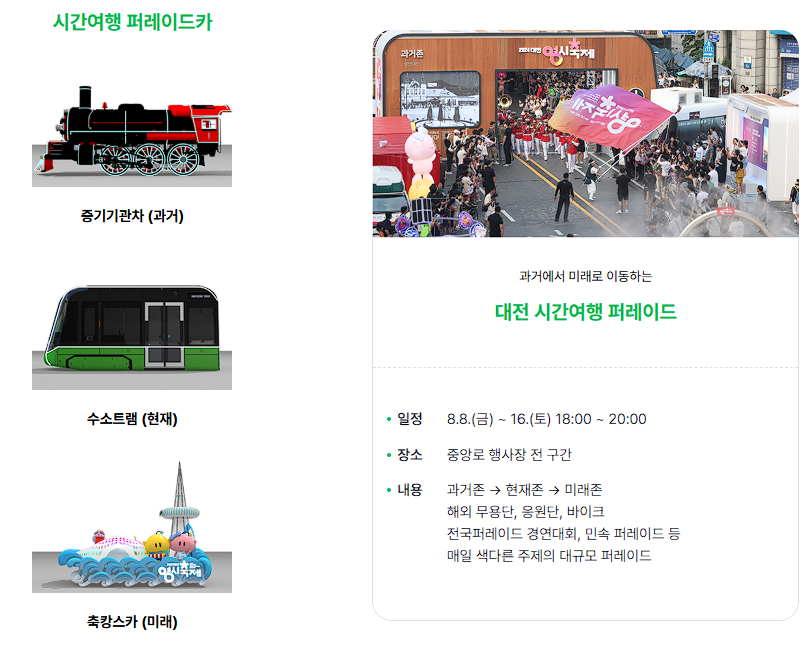 올해 대전 0시 축제 일정은 공연, 퍼레이드, 시민참여 프로그램이 풍성하게 준비되어 있습니다.