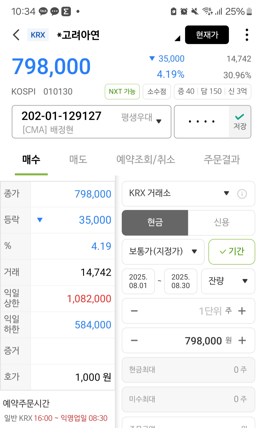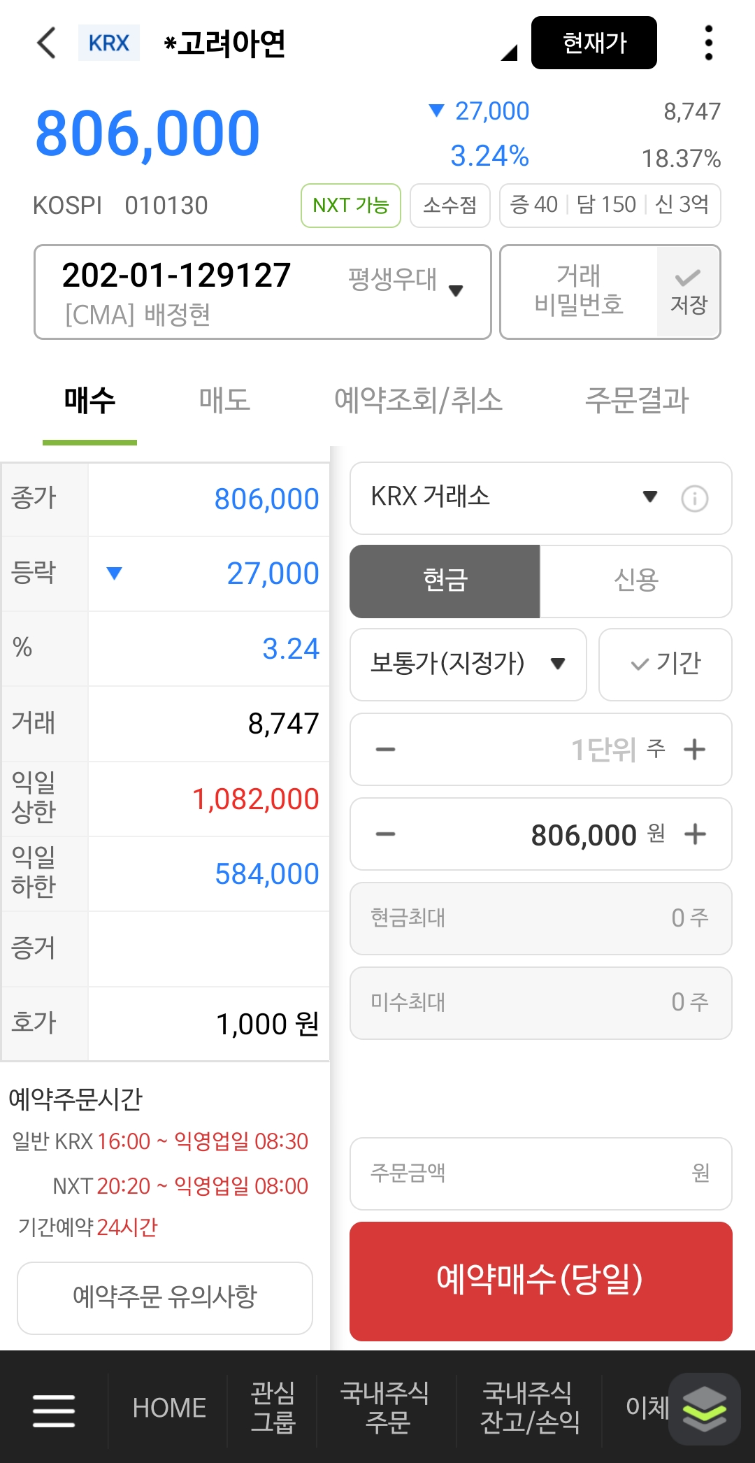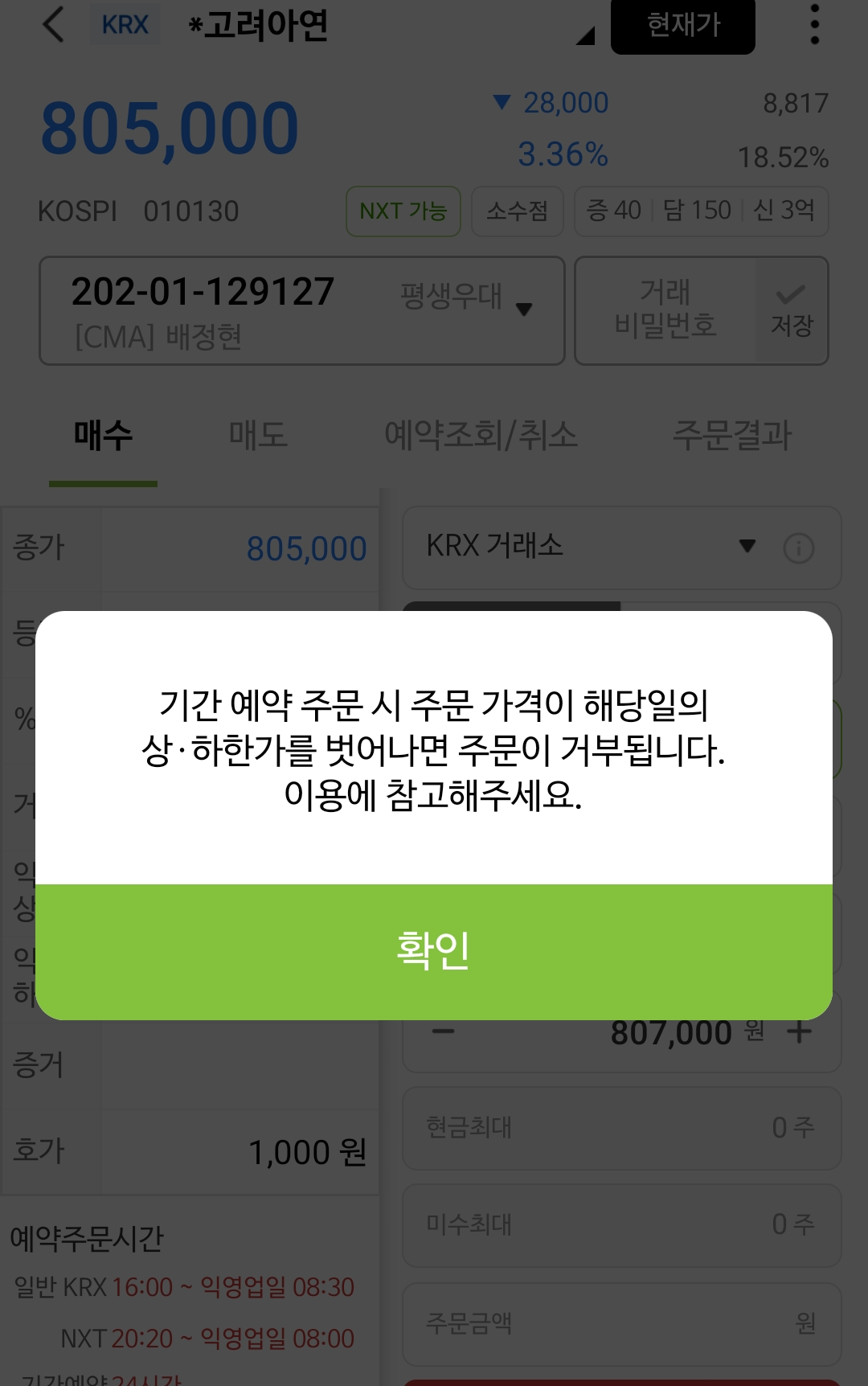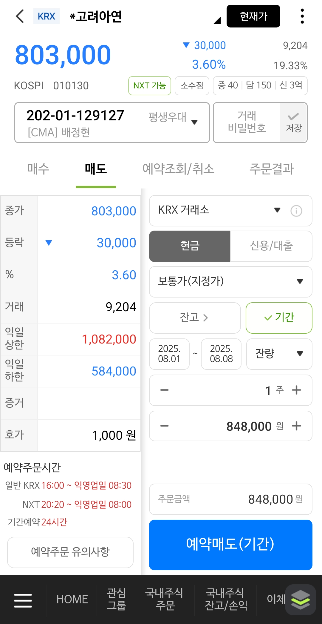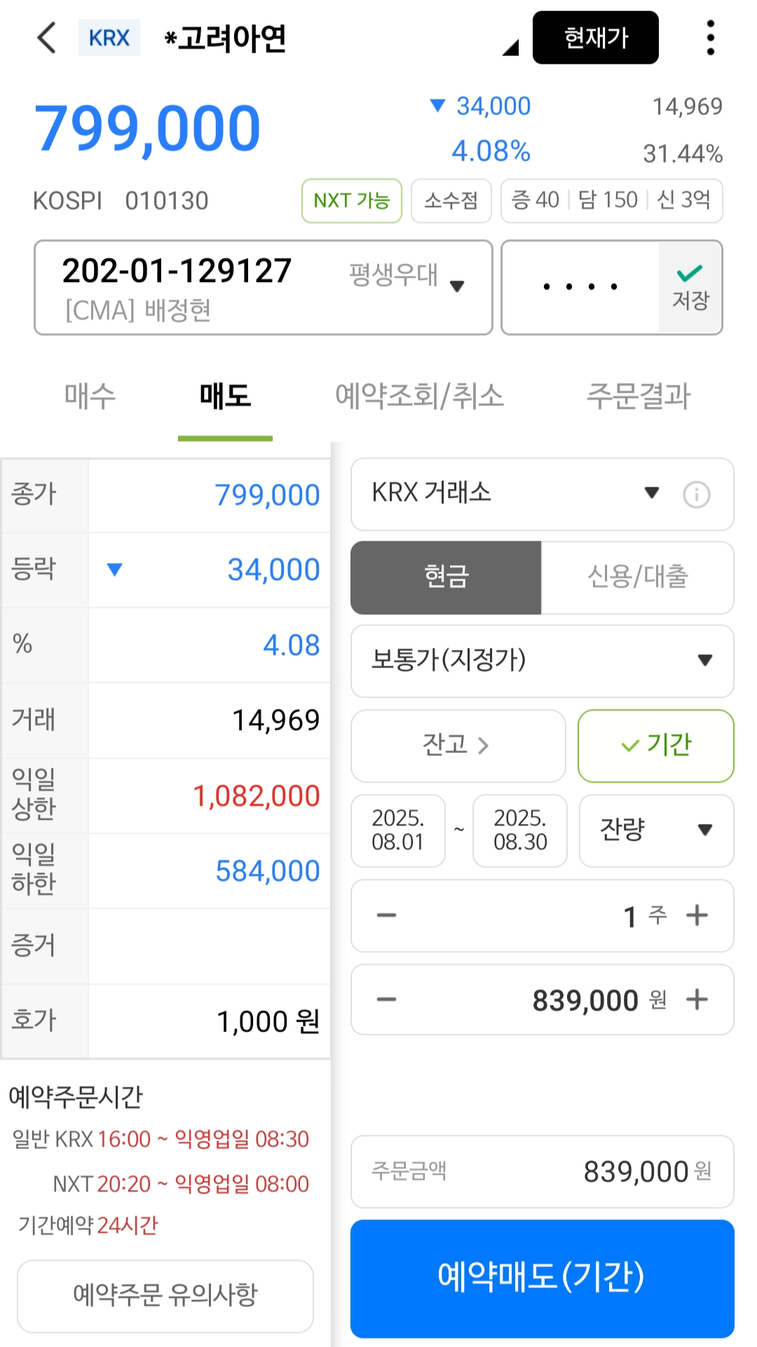 - 예: 839,00원에 1주 매도 → 예약매수 버튼 누르기